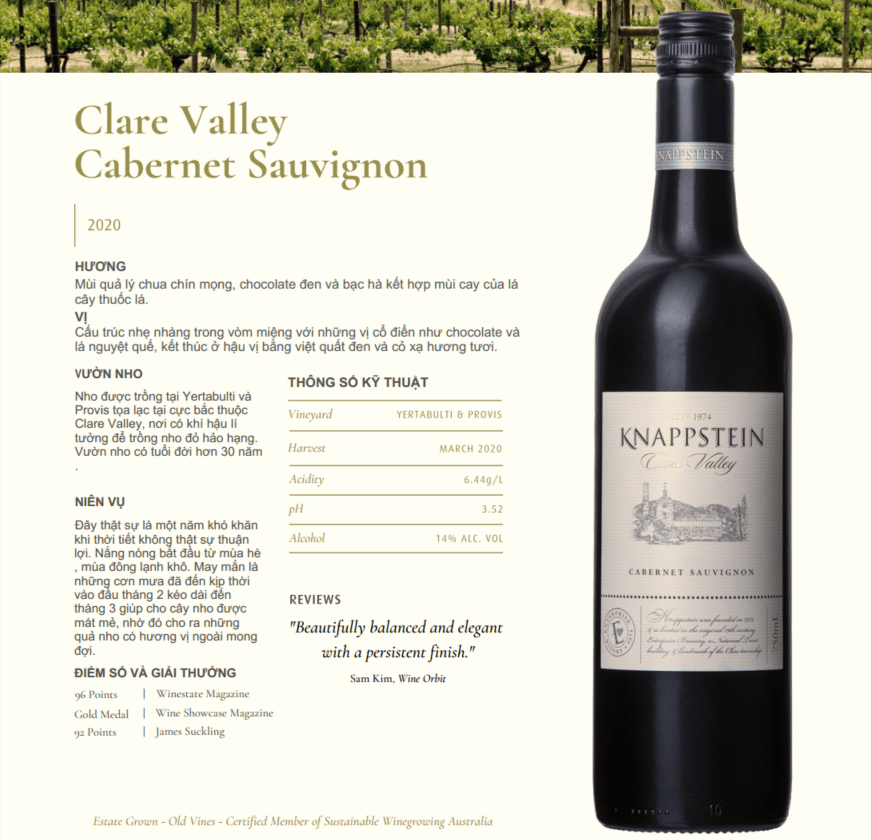 Vang đỏ Clare Valley Cabernet Sauvignon có hương vị của quả lý chua chín mọng, chocolate đen và bạc hà kết hợp mùi cay của lá cây thuốc lá.